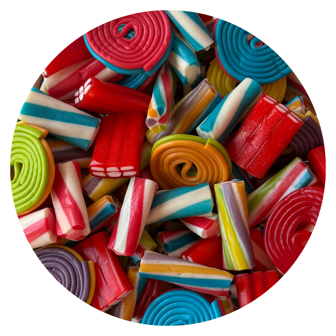 Ingredients: sugar, corn syrup, wheat flour, modified cornstarch, fish gelatin, palm oil, lactic acid, malic acid, artificial flavours, sodium lactate, trisodium citrate, salt, mono-and diglycerides, glycerin, beeswax, carnauba wax, fd&c yellow no. 5, fd&c yellow no. 6, fd&c red. 40, fd&c blue no.1, titanium dioxide.